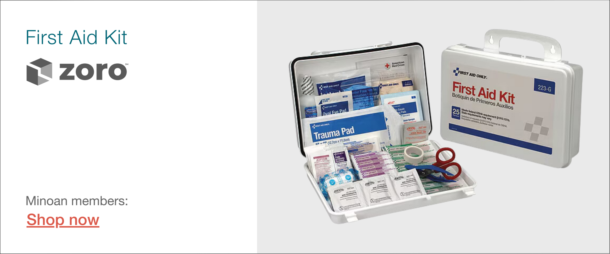 Zoro's first aid kit includes all the essentials — bandages, cold pack, eye pad, gauze roll, tape, and gauze pads — to handle small injuries and is easy to store in the bathroom.